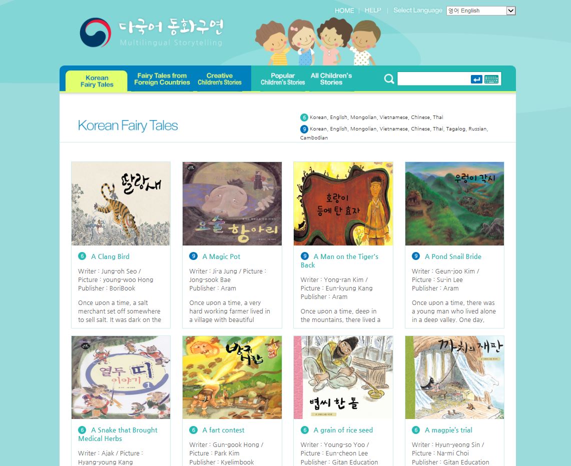 한국 전래동화, 외국 동화, 여러 이야기를 우리말과 영어, 중국어, 태국어 등 다양한 서비스를 제공하는