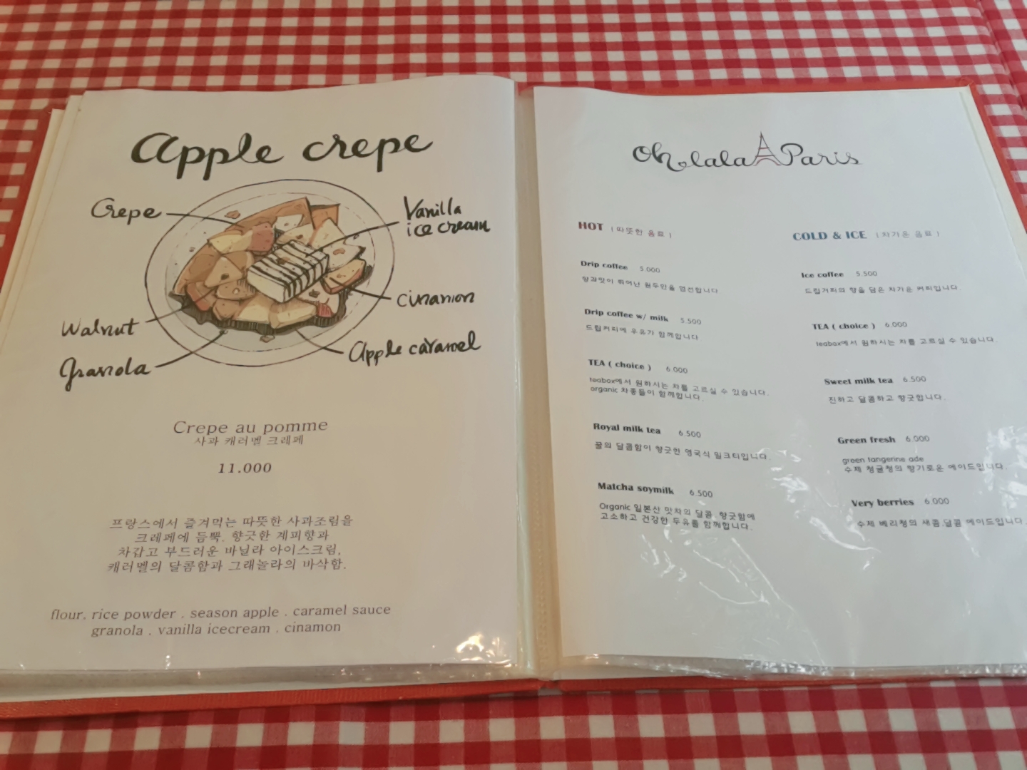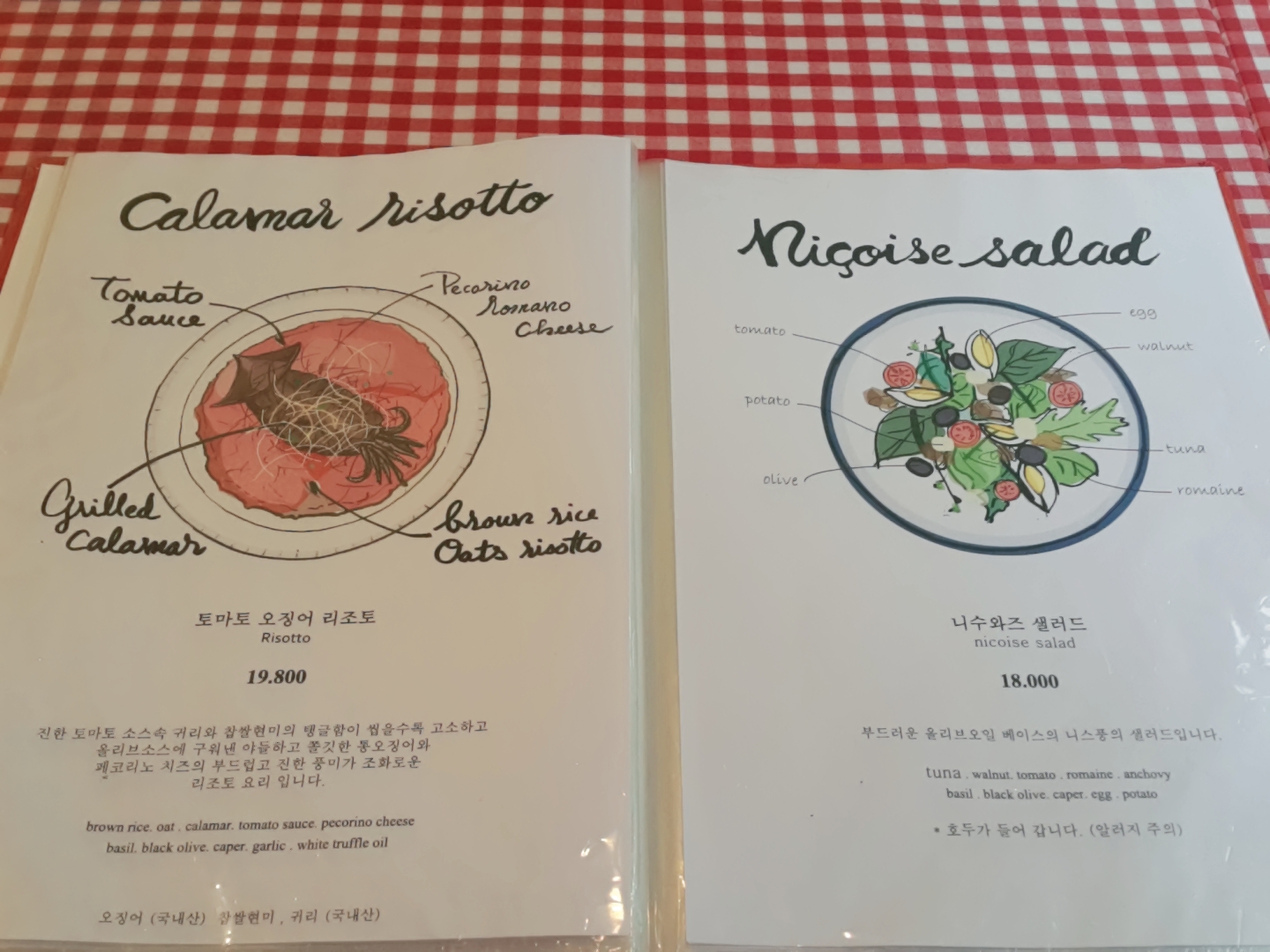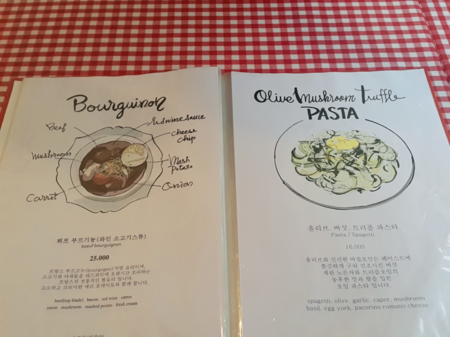 식탁이 빨간색 체크무늬 식탁보로 꾸며져 있어요. 메뉴판을 열어봅니다.