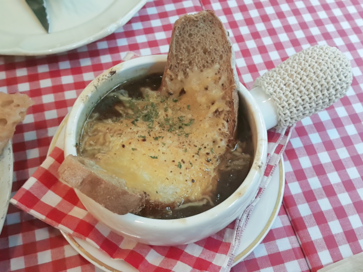프렌치어니언스프 - 쌀쌀한 Paris와 가장 잘 어울리는 뜨거운 오븐요리. 오랜시간 볶아 아리고 매운 맛은 달달한 감칠맛이 났어요. 이것도 신기하고 고소하니 맛있었네요.