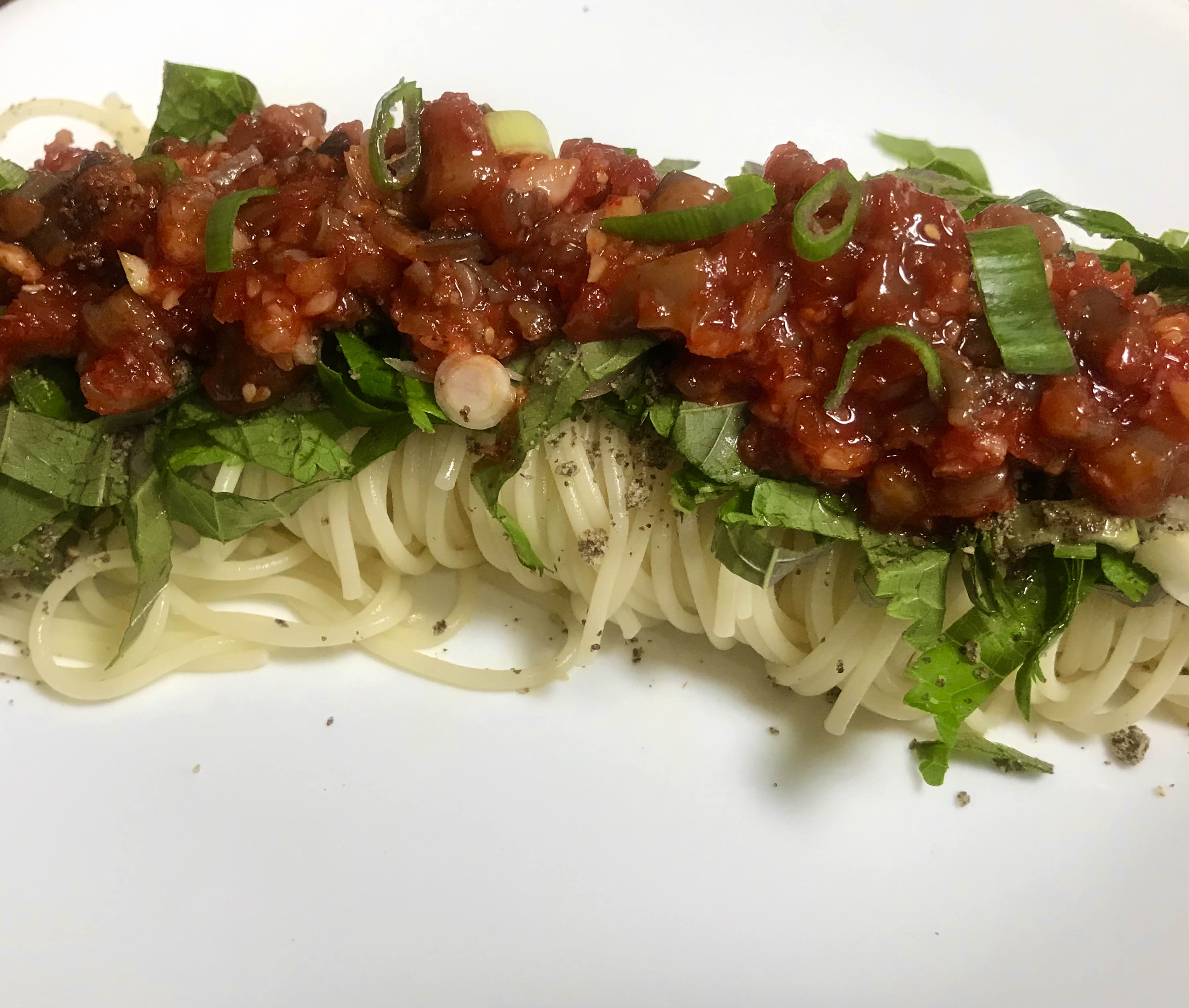 4. 스파게티면을 젓가락으로 길게 돌돌 말아서 접시 위에 놓는다. 그 위에 채썬 깻잎, 자른 파, 들깨 가루를 4순갈정도 뿌린 후, 양념된 낙지젓을 올린다. 마지막으로 들기름을 한 번 더 위에 뿌려주면 완성.