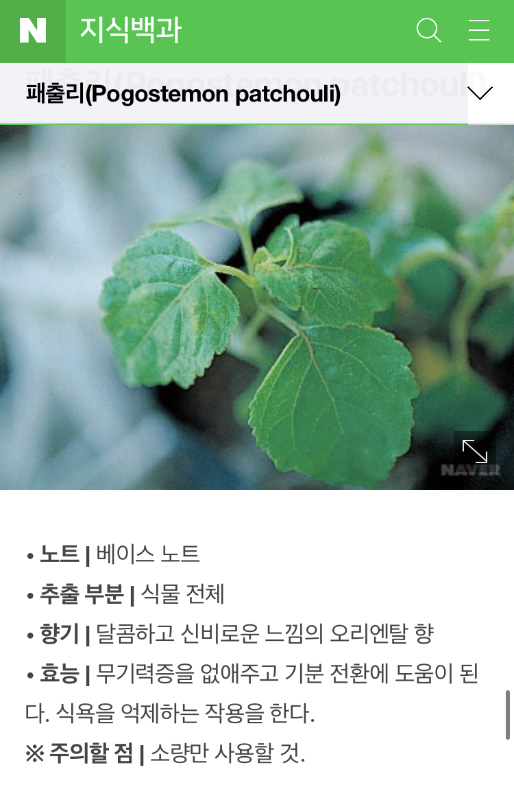 포장상자의 설명을 보니, 구성을 알 수 있었는데 복잡하다. 일단, 메인 3가지 향이 베르가못, 샌달우드, 패출리라고 한다. 패출리는 좀 생소하지만 초록창에 모두 검색을 해봤다.