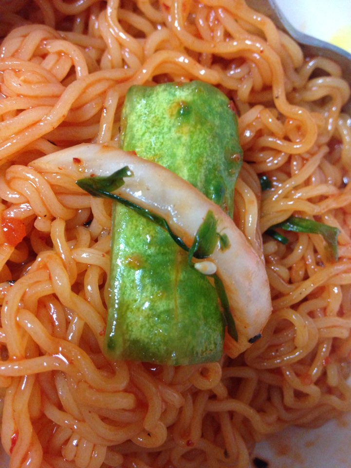 계란은 비빔면의 환상의 짝궁이죠. 매콤한 것을 먹기 전에 위를 보호할 겸 꼭 먹어줘야겠쥬? 오이 채를 썰려다가 집에 있는 삼삼한 오이김치로 대신합니다.